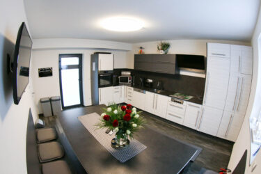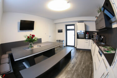 Desweiteren bieten wir Ihnen eine große Gemeinschaftsküche an, die selbstverständlich mit Kühlschrank, Mikrowelle, Backofen und Spülmaschine und entsprechendem Geschirr ausgestattet ist.
